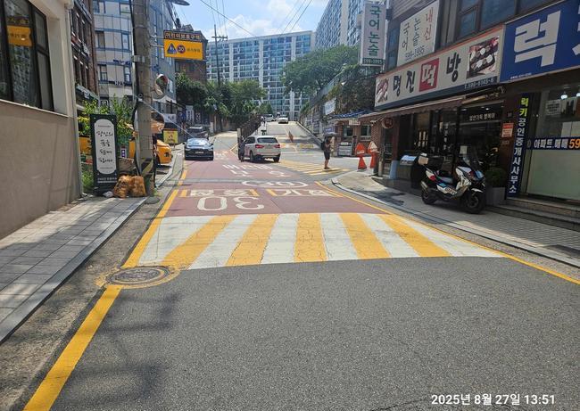 구는 정문 앞에는 횡단보도를, 신호등이 없던 구간에는 보행신호등을 새로 설치했다. 또 주변 도로의 제한속도를 시속 20㎞로 낮추고 과속방지턱 8개를 신설해 차량 서행을 유도하는 등 보행 안전성을 한층 높였다.