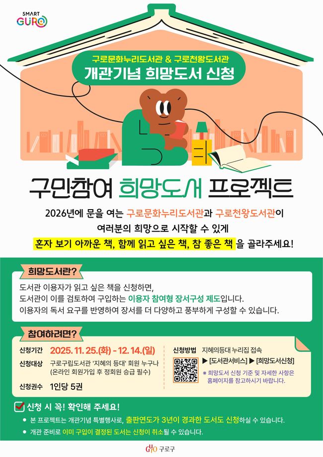 구로구(구청장 장인홍)는 오는 25일부터 다음 달 14일까지 내년 개관 예정인 구로문화누리도서관과 구로천왕도서관에서 ‘희망도서 프로젝트’를 선보인다. 이번 사업은 도서관 개관을 앞두고 주민 의견을 적극 반영해 장서를 구축하려는 취지에서 마련됐다.