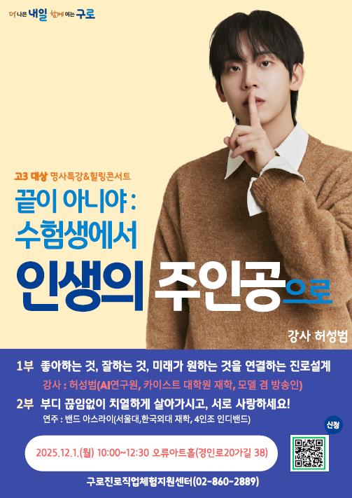 1부에서는 방송인이자 인공지능 연구원으로 활동 중인 허성범이 ‘끝이 아니야! 수험생에서 인생의 주인공으로’를 주제로 진로 특강을 진행한다.