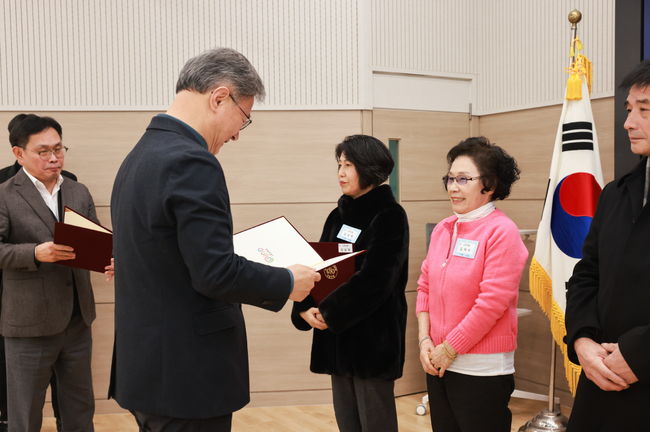 장인홍 구로구청장(왼쪽)이 2025년 하반기 모범구민 표창 수여식에서 수상자에게 표창장을 전달하고 있다.