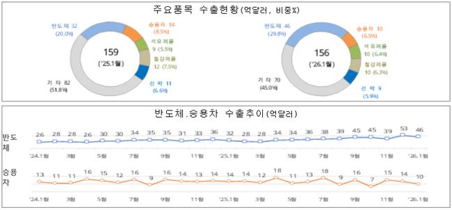 관세청이 발표한 2026년 1월 1~10일 수출입 잠정치에 따르면 이 기간 수출은 156억 달러, 수입은 182억 달러로 각각 전년 동기 대비 2.3%, 4.5% 감소했으며, 무역수지는 27억 달러 적자를 기록했다.