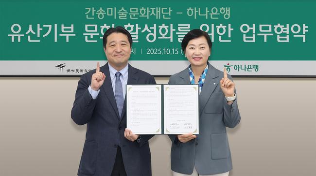 하나은행(은행장 이호성)은 지난 15일 서울 성북구 간송미술관에서 간송미술문화재단(이사장 전영우)과 유산 기부 활성화 및 문화예술 가치 확산을 위한 업무협약을 체결했다고 밝혔다.