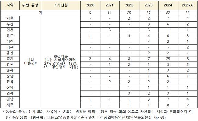 20일 국회 보건복지위원회 소속 남인순 의원(더불어민주당)이 식품의약품안전처로부터 제출받은 ‘반려동물 출입으로 인한 식품위생법 위반 현황’ 자료에 따르면, 시설 미분리로 인한 위반 건수는 2020년 5건에서 2024년 82건으로 급증했다. 특히 지난해 처음으로 80건 이상 행정처분이 내려지며 관련 위반이 급격히 늘었다.