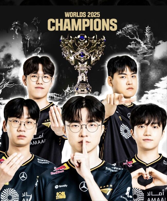 <리그 오브 레전드(LoL, 롤) 2025 월드 챔피언십(롤드컵)> 에서 우승한 T1 선수들. 최현준, 문현준, 이상혁, 이민형, 류민석세계 최대 e스프츠 행사인 '롤드컵'에서 T1이 통산 6번째 우승이자 대회 사상 첫 3연패(쓰리핏)를 달성했다.