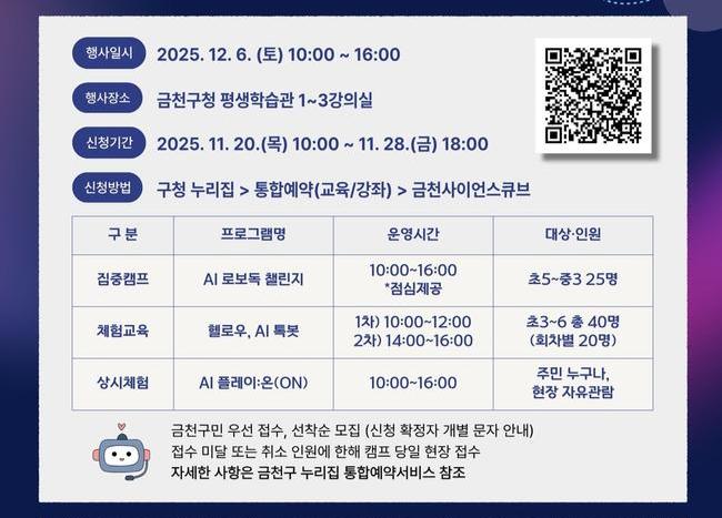 금천구(구청장 유성훈)는 오는 12월 6일 금천구청 평생학습관에서 `미래를 꿈꾸는 AI 로봇 캠프`를 개최한다고 밝혔다.