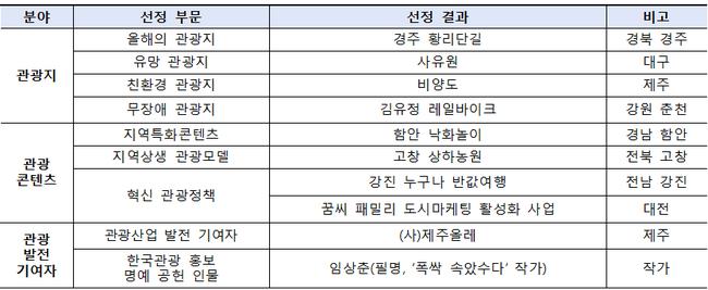 올해로 15회째를 맞은 ‘한국 관광의 별’은 한 해 동안 관광산업 발전에 기여한 장소와 콘텐츠, 인물 등을 선정해 시상하는 대표 사업이다. 올해는 관광지, 관광콘텐츠, 관광발전 기여자 등 3개 분야로 나누어 총 10개가 선정됐다.