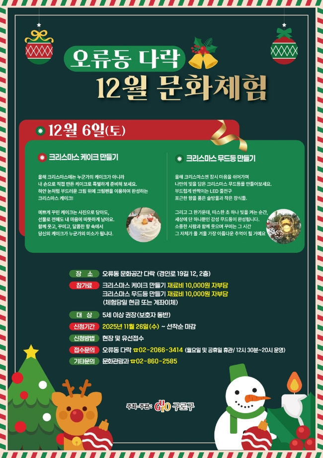 장인홍 구로구청장은 “연말을 맞아 주민들이 가까운 문화공간에서 따뜻하고 즐거운 시간을 보내길 바란다. 앞으로도 생활 속에서 문화와 휴식을 누릴 수 있도록 다양한 프로그램을 확대할 계획”이라고 말했다.