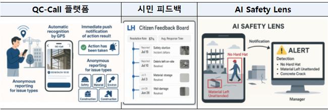 우수상으로는 두 건이 선정됐다. ‘국민 품질 감리단(QC-Call)’은 현장 안전·품질 문제를 실시간·익명으로 제보할 수 있는 국민참여형 감리 시스템으로, 제보 이미지에서 위험요소를 자동 인식하고 조치 과정을 타임라인으로 공개해 투명한 품질관리를 구현하는 방안이다.