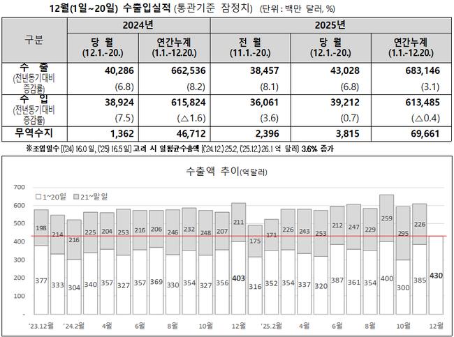 연간 누계로 보면 1월 1일부터 12월 20일까지 수출은 6,831억 달러로 전년 대비 3.1% 증가했고, 수입은 6,135억 달러로 0.4% 감소했다. 같은 기간 무역수지는 696억 달러 흑자를 기록했다.