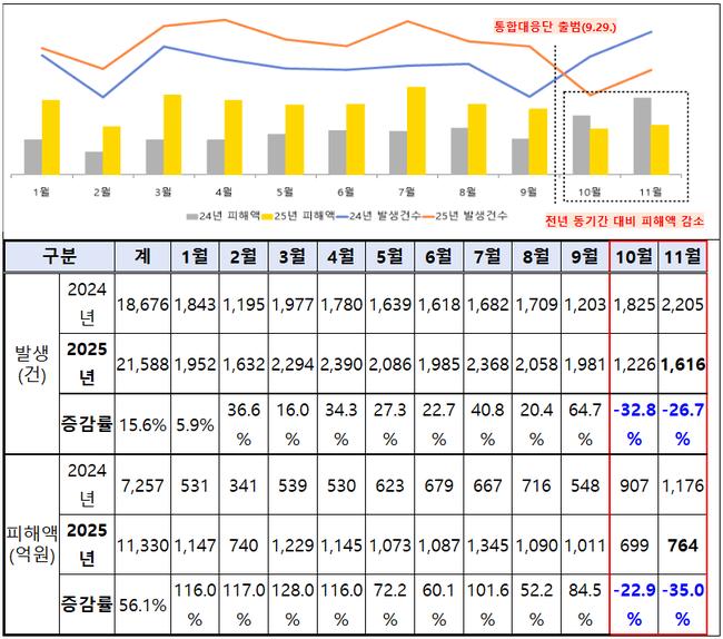 피해 추이 분석 결과, 올해 11월까지 누적 발생건수는 2만1,588건으로 전년 동기 대비 15.6% 늘었고, 피해액은 1조1,330억 원으로 56.1% 증가했다. 다만 연초부터 매월 전년도 통계를 상회하던 피해지표가 10~11월에는 감소했다는 게 당정 설명이다. 10월은 발생건수 32.8%, 피해액 22.9%가 줄었고, 11월도 발생건수 26.7%, 피해액 35.0% 감소했다.