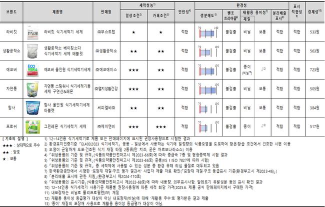 한국소비자원은 식기세척기 보급 확대에 따라 사용이 늘고 있는 식기세척기 세제에 대해 세척성능, 안전성, 환경성, 경제성을 종합적으로 시험·평가했다. 시험 대상은 라비킷, 생활공작소, 에코버, 자연퐁, 탐사, 프로쉬 등 정제형 세제 6개 제품으로, 시험 결과는 ‘소비자24’ 누리집 내 ‘비교공감’란을 통해 제공될 예정이다.