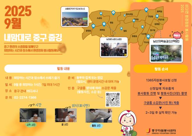 서울 중구는 9월부터 11월까지 중구자원봉사센터와 협력해 참여자가 자유롭게 시간과 장소를 정해 실천할 수 있는 환경정화 봉사활동 「내맘대로 중구 줍깅」을 운영한다.