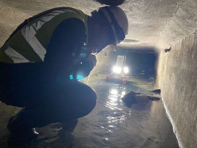 지하 공사 현장에서 측량 작업을 하고 있는 근로자