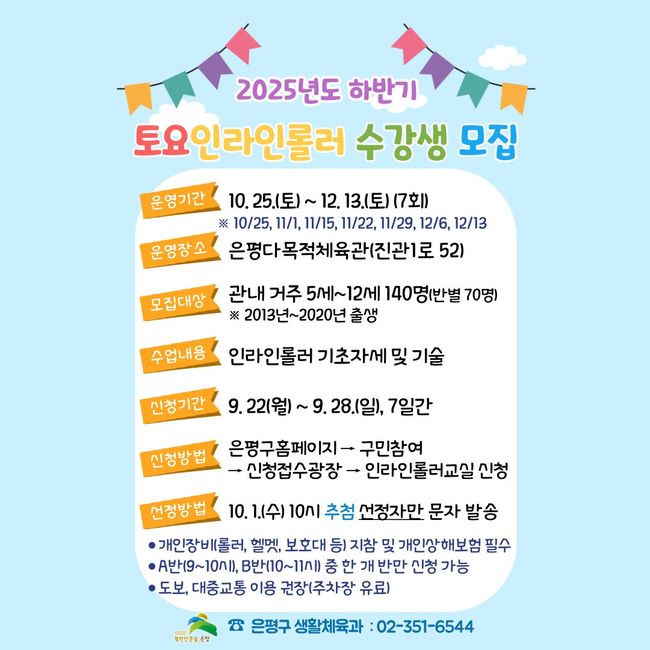서울 은평구가 관내 어린이들의 생활체육 활성화를 위해 ‘하반기 토요 인라인롤러 교실’ 참여자를 모집한다고 밝혔다.