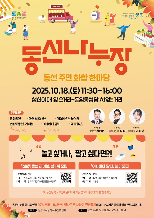 서울 성북구(구청장 이승로)는 10월 18일 오전 11시 30분부터 오후 4시까지 성신여대 앞 오거리에서 돈암동성당 구간까지 이어지는 도로를 전면 통제하고, ‘2025년 차 없는 거리 동선나누장’을 연다.
