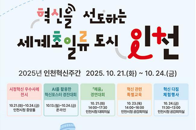 인천광역시(시장 유정복)는 혁신 행정의 성과를 확산하고 공직자의 혁신역량을 강화하기 위해 오는 10월 21일부터 24일까지 '2025 인천 혁신주간'을 개최한다고 밝혔다.