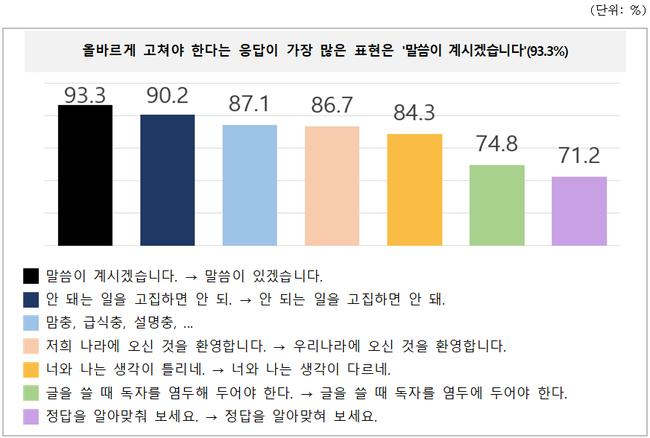 가장 높은 개선 요구를 받은 표현은 ‘그 제품은 품절이십니다’, ‘커피 나오셨습니다’ 등 과도한 높임 표현으로, 응답자의 93.3%가 고쳐야 한다고 답했다.